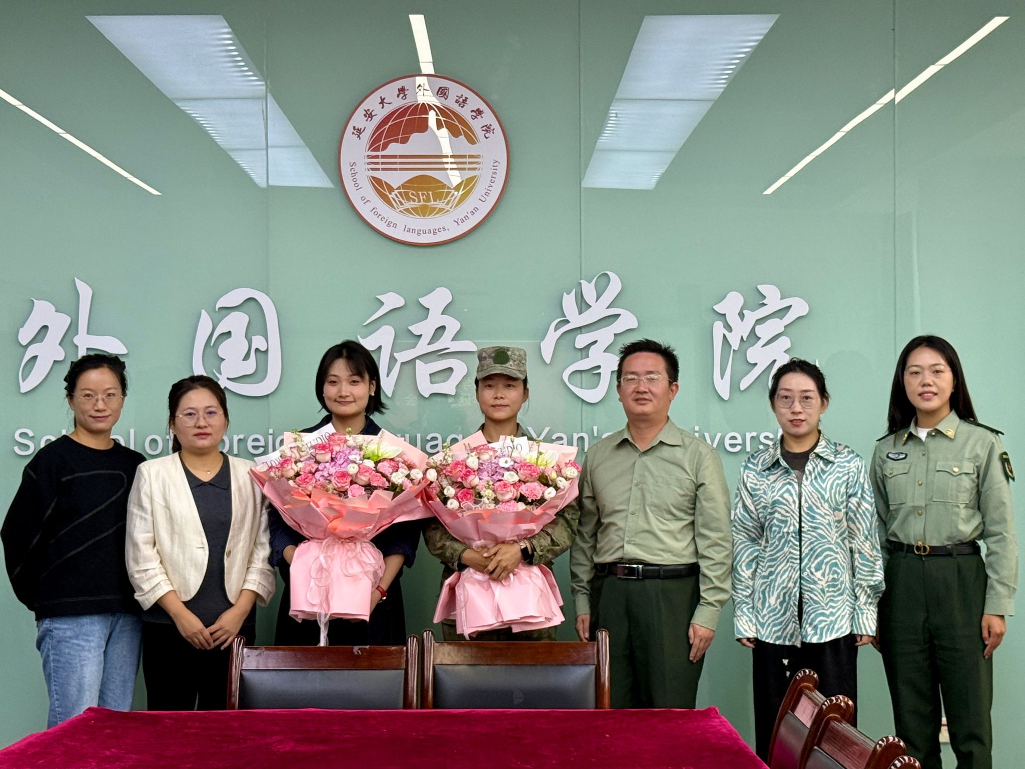 为表达学院对退伍大学生们的崇高敬意与热烈欢迎,班主任代表李维和马靖霞分别为王佳芋、姚慧聪同学佩戴上象征荣誉与褒奖的大红花,并送上芬芳的鲜花。