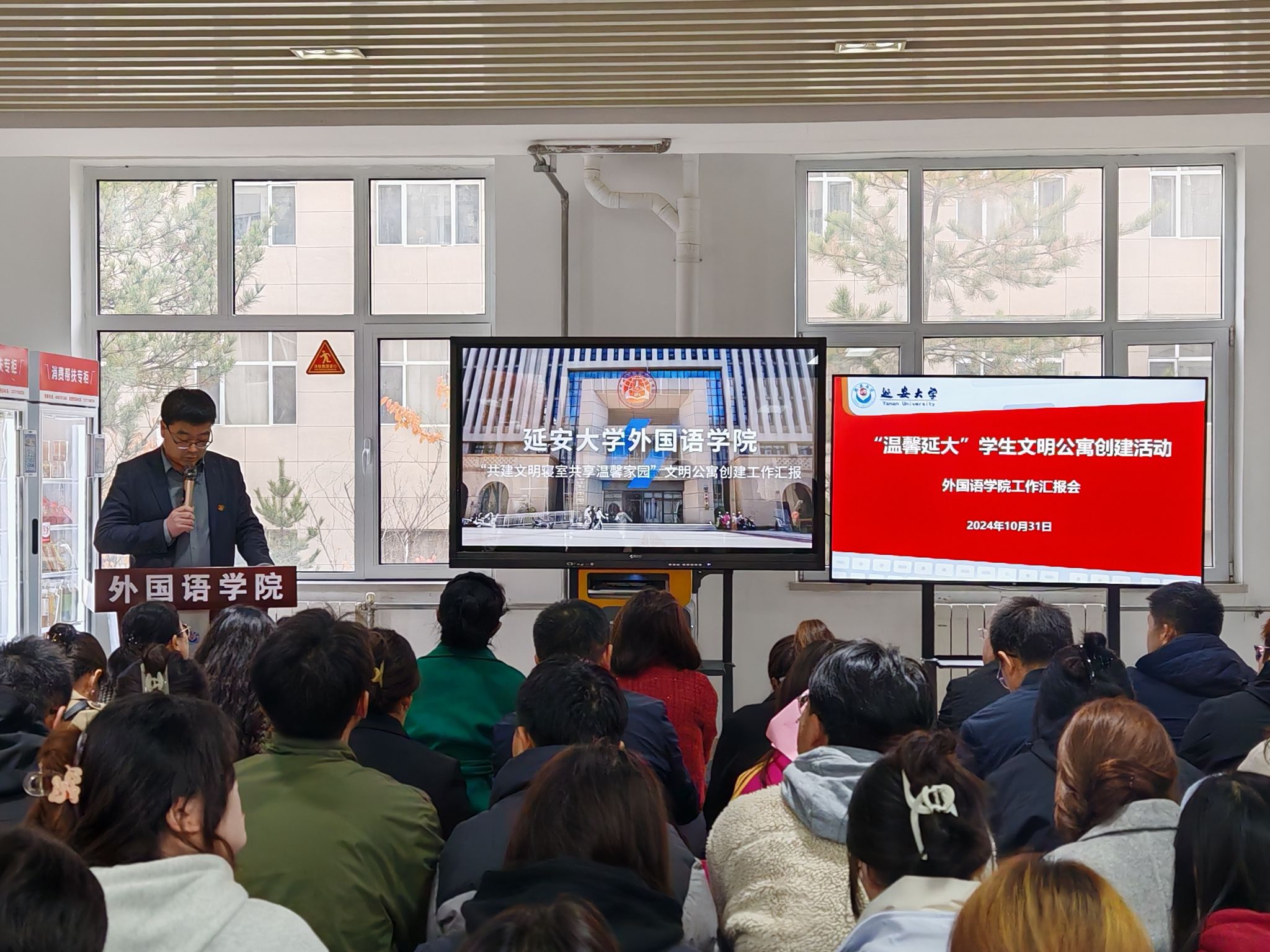 为进一步提升学生教育管理服务质量,积极营造良好的育人环境,推进“温馨延大”学生文明公寓创建工作,10月31日下午,学工部在8号宿舍楼组织开展了外语学院学生文明公寓创建作汇报观摩会。学工部部长张翔、外语学院党委书记梁艳、学工部副部长王红,各学院党委副书记、辅导员、学生干部等参加了汇报观摩会。会议由外语学院党委副书记许多文主持。