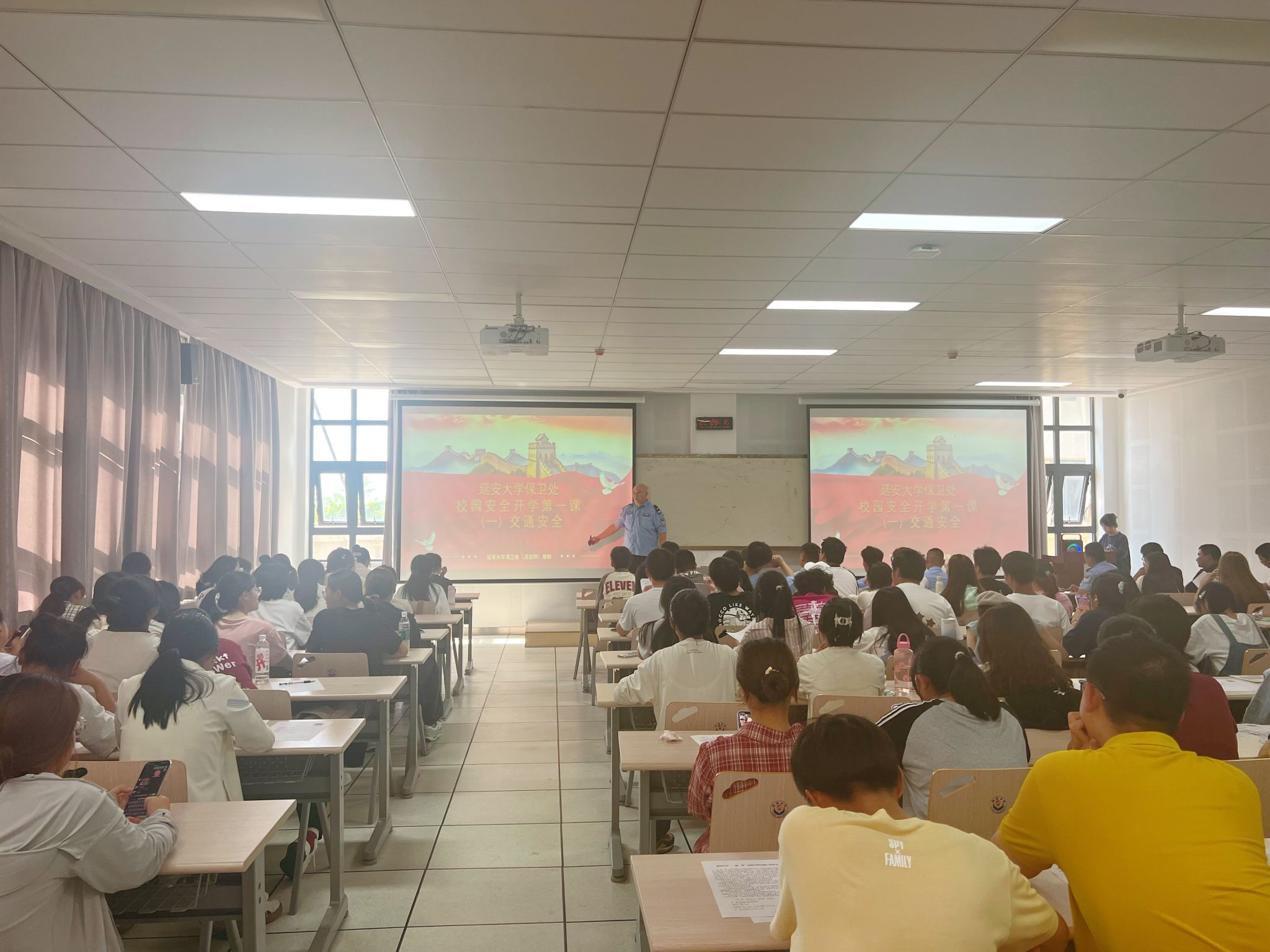 随后,举行了新生入学教育系列报告会,报告会由姜家兴主持。保卫处周刚作了《校园安全开学第一课》的主题报告,以生动的案例、幽默的语言、高超的技巧详细讲解了交通安全、财产安全、人身安全等基本常识,号召同学们不断提高安全意识,牢记自己是安全第一责任人,为构建平安校园、和谐校园贡献自己的力量。