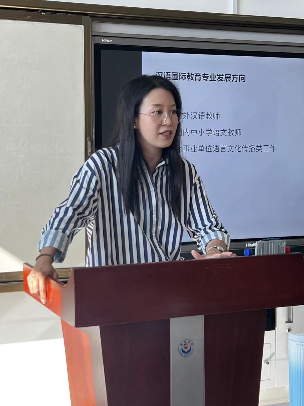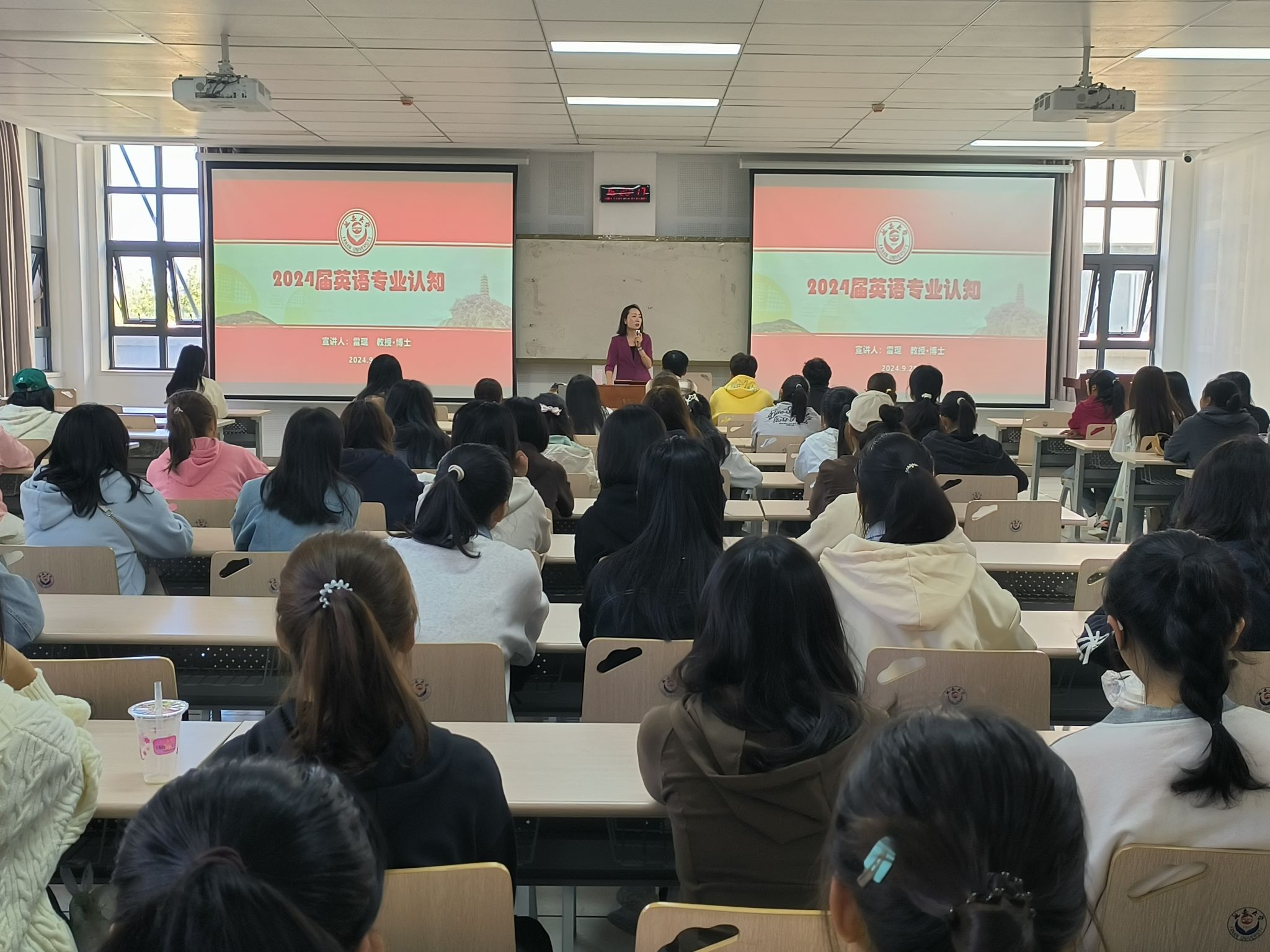 英语系主任雷琨、汉语国际教育系主任王雨薇、日语系主任董璐分别从专业角度进行了专业认知教学,详细介绍了专业培养方案、专业发展趋势、专业学习方法,鼓励全体同学珍惜大学生活、夯实专业基础、练就过硬本领,不负青春、不负韶华。