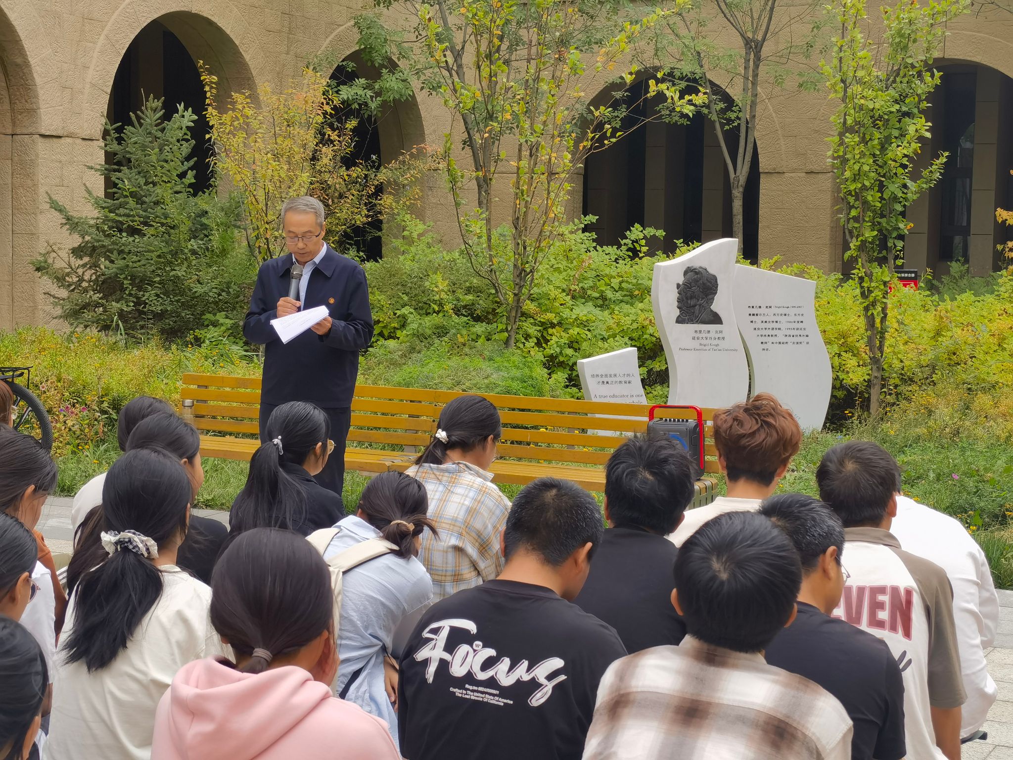 学院高治东教授在外语楼前作了题为《传承“克阿精神” 赓续外院传统 抒写时代风华》的现场教学,详细介绍了克阿教授在外语教学事业上作出的突出贡献,希望全体同学梳理国际化视野、具有民族情怀、深入学习研究、发扬奉献精神,以彻底的觉悟、坚定的决心、坚韧不拔的毅力谱写自己在大学期间的新篇章。