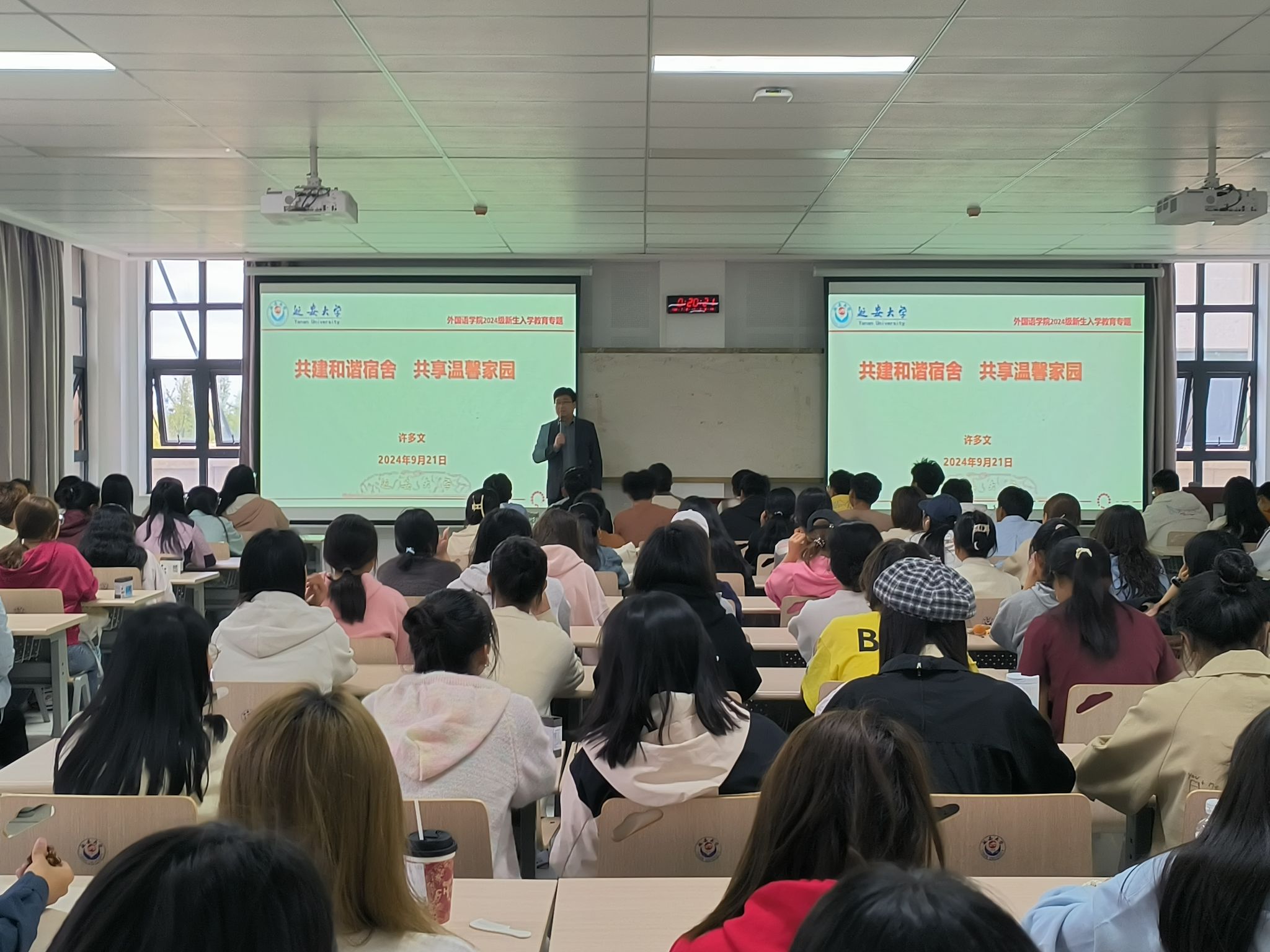 党委副书记许多文作了题为《共建和谐宿舍 共享温馨家园》的报告。他在报告中从大学宿舍成员成长发展、主动作为和共建共享的理念讲起,分析了大学宿舍和高中宿舍的差异,讲解了构建和谐文明宿舍的目标、路径和方法,要求同学们在新的宿舍环境中树立远大理想,团结互助,严格要求,共同营造文明和谐、积极向上的宿舍文化。