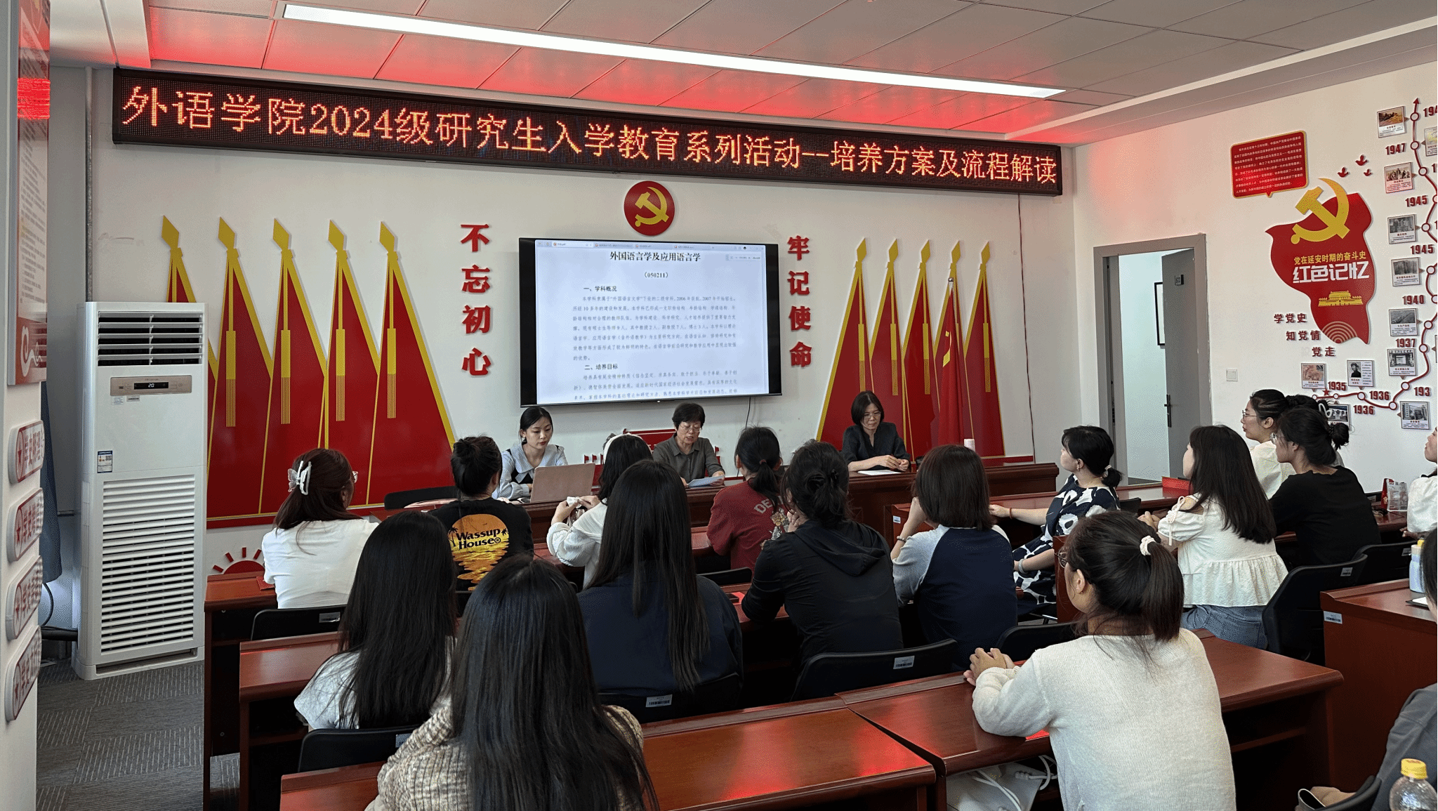 8月30日上午,我院在513会议室举行了2024级研究生外应专业、学科教学(英语)专业培养方案解读及培养流程介绍专题报告会。外应专业导师组组长张志敏老师、学科教学(英语)专业导师组组长张纪鸽老师分别从学科概况、培养目标、研究方向及课程设置、专业培养流程和要求等方面进行了详细介绍,使同学们对所学专业有深入的了解。