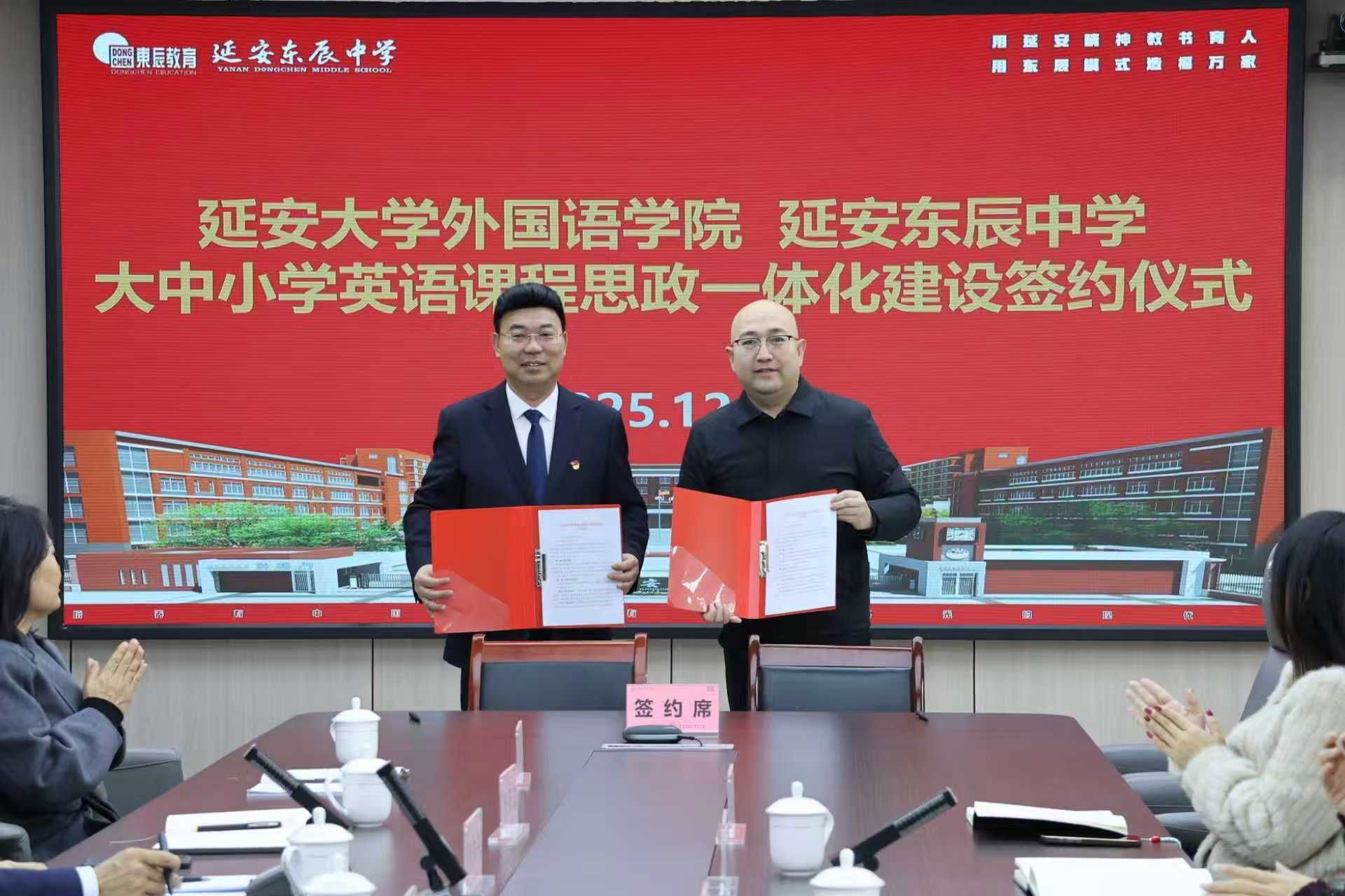 为进一步深化大中小学思政教育一体化建设,服务学校红色资源育人示范校建设。12月16日,我院与延安东辰中学举行“大中小学英语课程思政一体化建设”签约和授牌仪式。延安励博教育集团党总支书记韩卿元、延安东辰学校校长李立刚、副校长、高中部校长李国江、副校长王永强、初中部书记张怀志、初中部校长王国聪、附属小学校长王金玲、教研部长郝炳宏,学院党委书记梁艳、副院长常琅、雷琨及两校师生代表出席仪式。仪式由延安东辰学校德育副校长李向东主持。