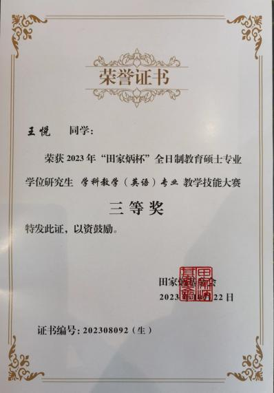 本次教学技能大赛决赛包含模拟授课(10分钟)和现场答辩(3-5分钟)两个环节。经过激烈的角逐,我院2022级研究生王悦荣获三等奖,指导教师为高治东教授。本次比赛展示了我校学科教学(英语)研究生的综合素质和创新能力,也体现了我院研究生培养工作的卓越成效。