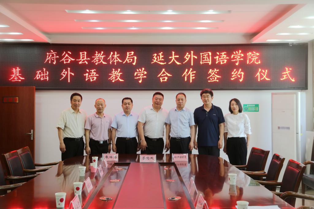 为扎实推进师范专业认证工作,建立“三位一体”协同育人培养机制,提高县域中小学校外语教师教育教学水平,6月10日上午,我院与榆林市府谷县教体局在府谷县签订了基础外语教育合作协议。府谷县副县长刘春雷,教体局党组书记、局长吕元,府谷县政府办、财政局、府谷中学等部门负责人,我校副校长付峰,我院院长梁润生、党委书记梁艳、副院长李世荣等出席了签字仪式。签字仪式由刘春雷副县长主持。