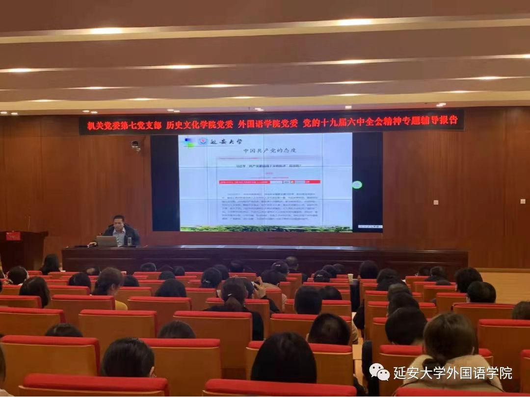 报告中,谭虎娃副校长分别围绕“总结党的百年奋斗的重大成就和历史经验的重大意义,党的百年奋斗的初心使命和重大成就,中国特色社会主义新时代的历史成就和历史性变革,党的百年奋斗的历史意义和历史经验,以史为鉴、开创未来的重要意义,从党的百年奋斗历程中汲取智慧和力量”等六个方面对党的十九届六中全会精神进行了全面系统的阐释,并结合公海贵宾会5500iii具体实际进行了深入地解读。