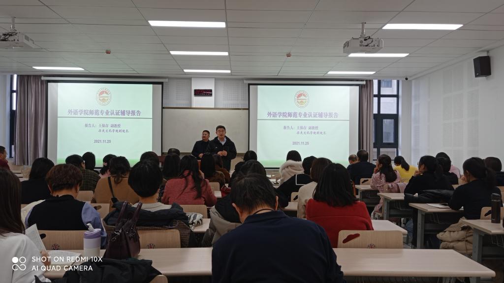 11月25日下午,我院邀请历史文化学院副院长王保存在外语楼211报告厅为我院作了师范专业认证专场辅导。学院领导及全体教师参加了报告会。报告会由梁润生院长主持。