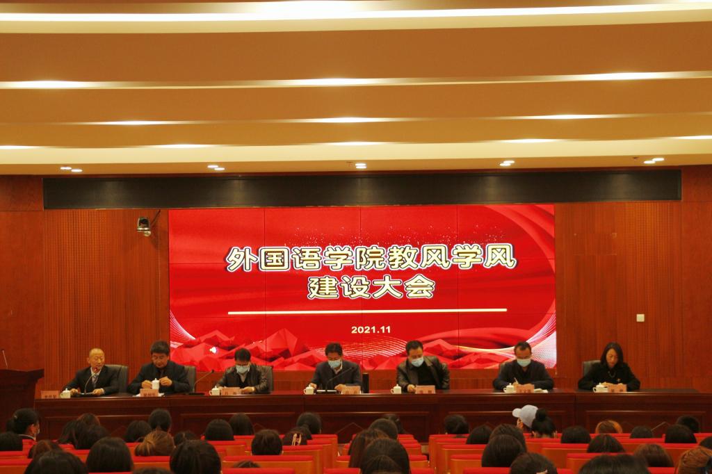 为积极构建“以教风带学风、以学风促教风”的体制机制,形成“教风正、学风浓、院风优”的学院文化,11月5日上午,我院在行政楼举行教风学风建设大会。副校长吕达、教务处处长吕磊、研究生学院院长王文强、学工部部长张翔到会祝贺。外语学院领导、全体师生参加。大会由李世荣副教授主持。