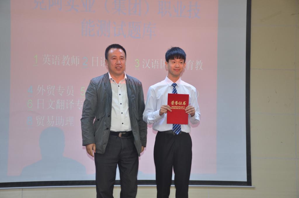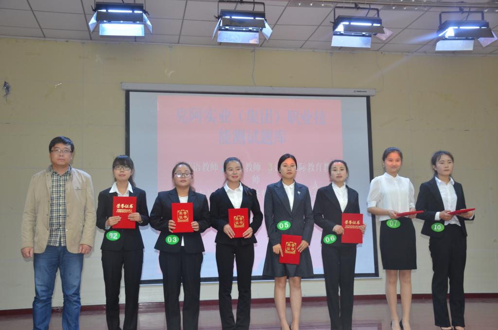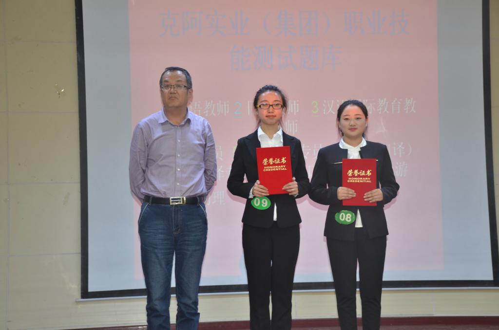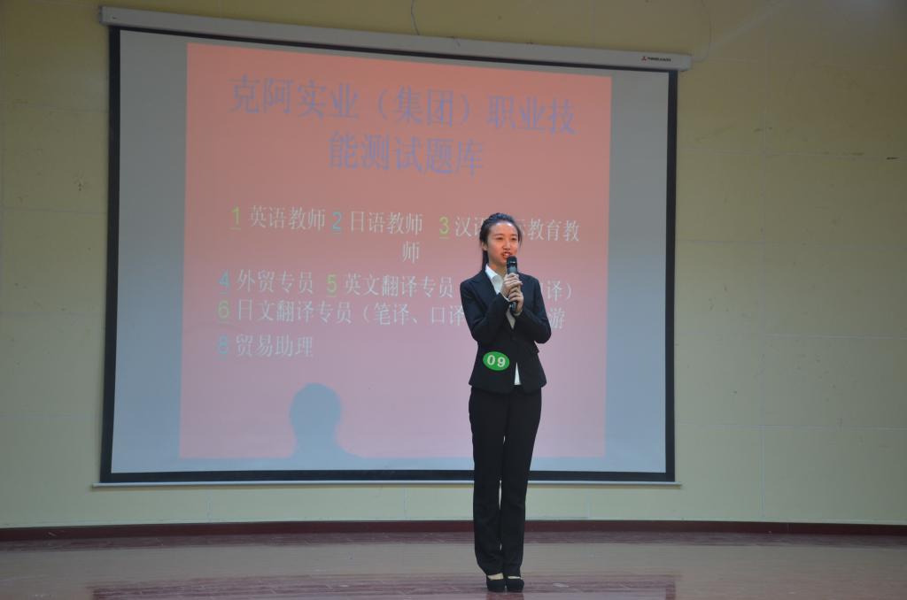 模拟招聘会在主持人介绍模拟公司延安克阿实业(集团)有限公司的基本情况及招聘职位中拉开了序幕。随后,十名经过简历投递、简历筛选等环节选拔的13级学生依次亮相,并以自我介绍、职业技能测试、现场答问三个环节接受了用人单位的层层考核,顺利通过面试进入延安克阿实业(集团)有限公司。在模拟招聘会过程中,自我介绍环节展示了应聘者良好的外语口语素质,职业技能测试考验了应聘者现场的反应能力,现场外语答问赢得观众的阵阵掌声。最后,与会嘉宾为获奖应聘者颁奖。