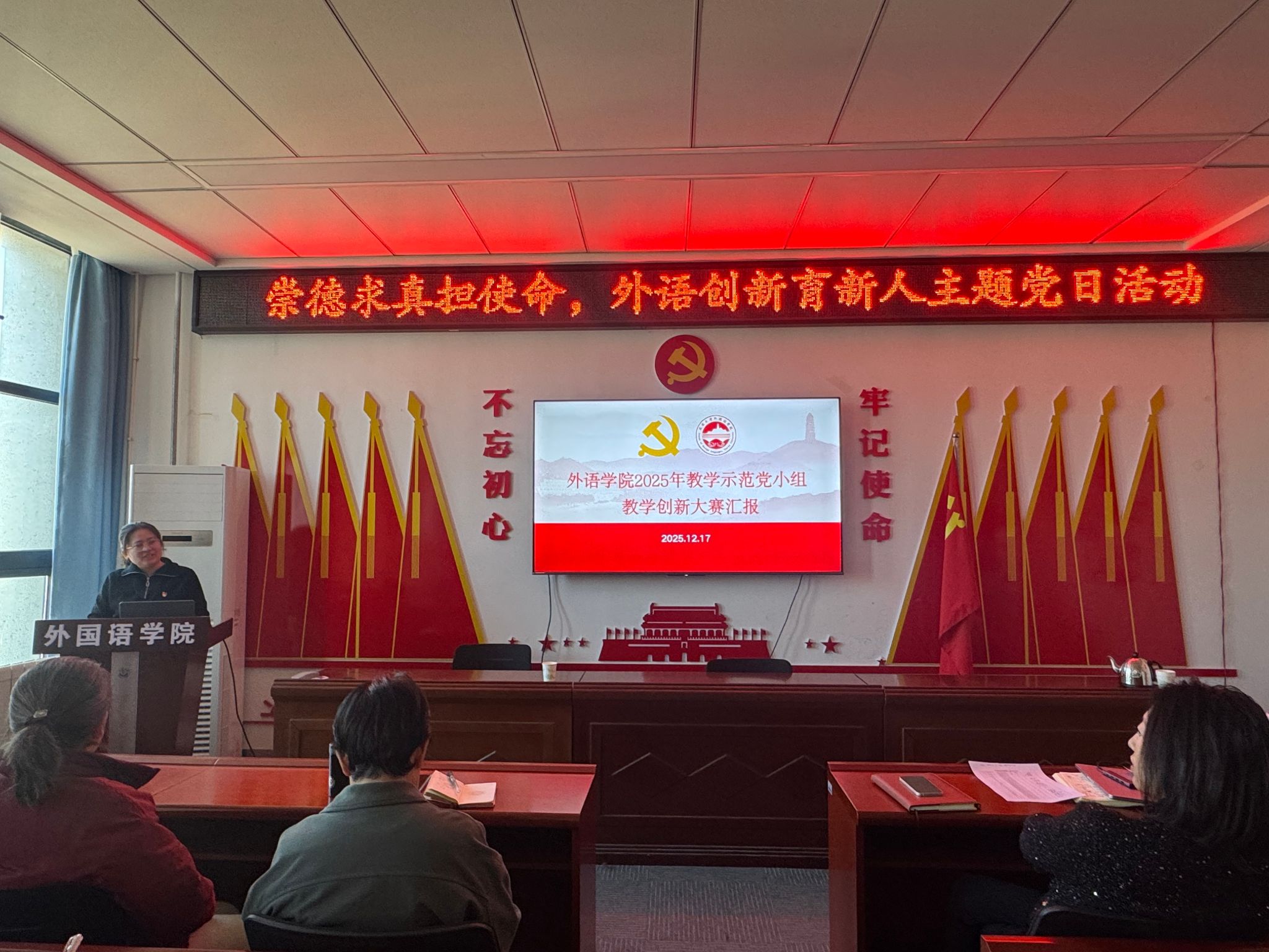 为进一步深化教学改革,提高教师课堂教学水平,12月17日下午,我院在外语楼513党建活动室举办以“崇德求真担使命,教学创新育新人”的主题党日活动,回顾总结2025年教学创新大赛,动员部署2026年教学创新大赛。活动由教学示范党小组牵头组织,教学示范党小组各位成员、教工党支部全体党员参加了本次活动。活动由教学示范党小组组长惠霞副教授主持,院党委书记梁艳出席并讲话。