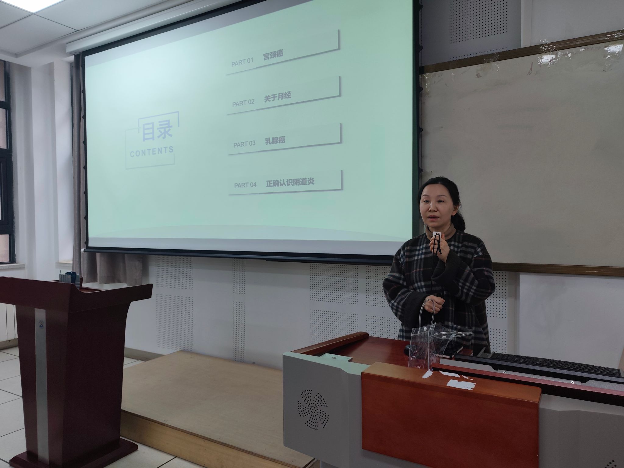 讲座中,王媛主任结合女大学生的年龄特点与生理需求,以通俗易懂的语言、真实鲜活的临床案例,系统讲解了女性常见妇科疾病、生殖健康防护、经期科学护理、心理健康调适等核心内容,重点解读了宫颈癌、卵巢癌等常见妇科肿瘤的预防筛查知识,以及科学避孕、合理膳食、规律作息对女性健康的重要意义。讲解过程中,王媛主任注重理论与实践结合,既普及专业医学知识,又针对女大学生常见的健康困惑进行细致解答,引导大家摒弃健康误区,树立“预防为主、防胜于治”的健康理念,教会大家如何在日常生活中科学呵护自身健康,学会自我排查健康隐患,遇到问题及时就医。现场互动氛围浓厚,同学们认真聆听、积极思考,不时记录重点内容,针对自身疑问主动提问,王媛主任逐一耐心回应,用专业、细致的讲解赢得了在场同学们的阵阵掌声。