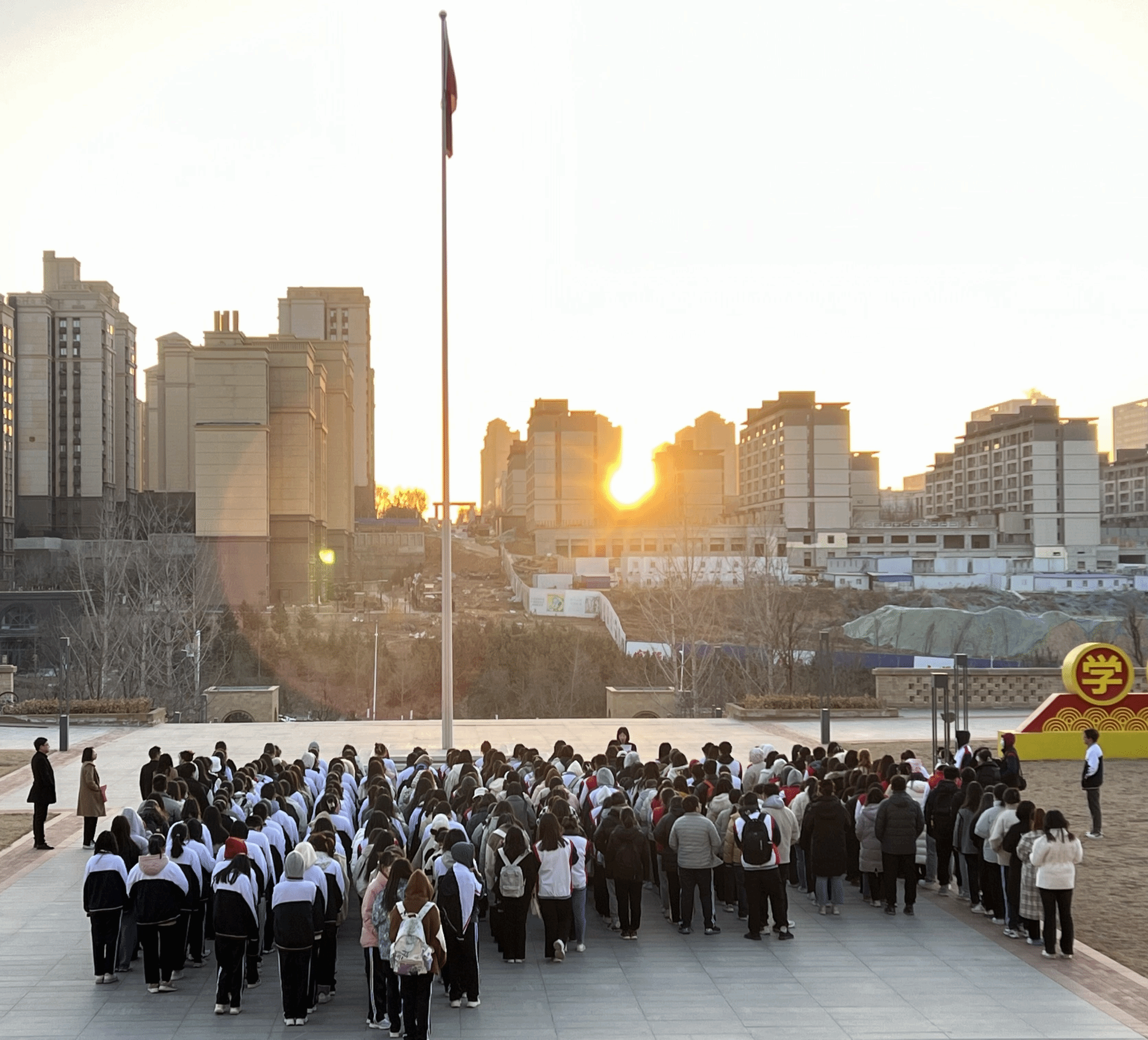 在庄严激昂的国歌声中,国旗护卫队步伐整齐,护送国旗入场。鲜艳的五星红旗随着初升的朝阳冉冉升起。全体师生齐唱国歌,对国旗行注目礼。