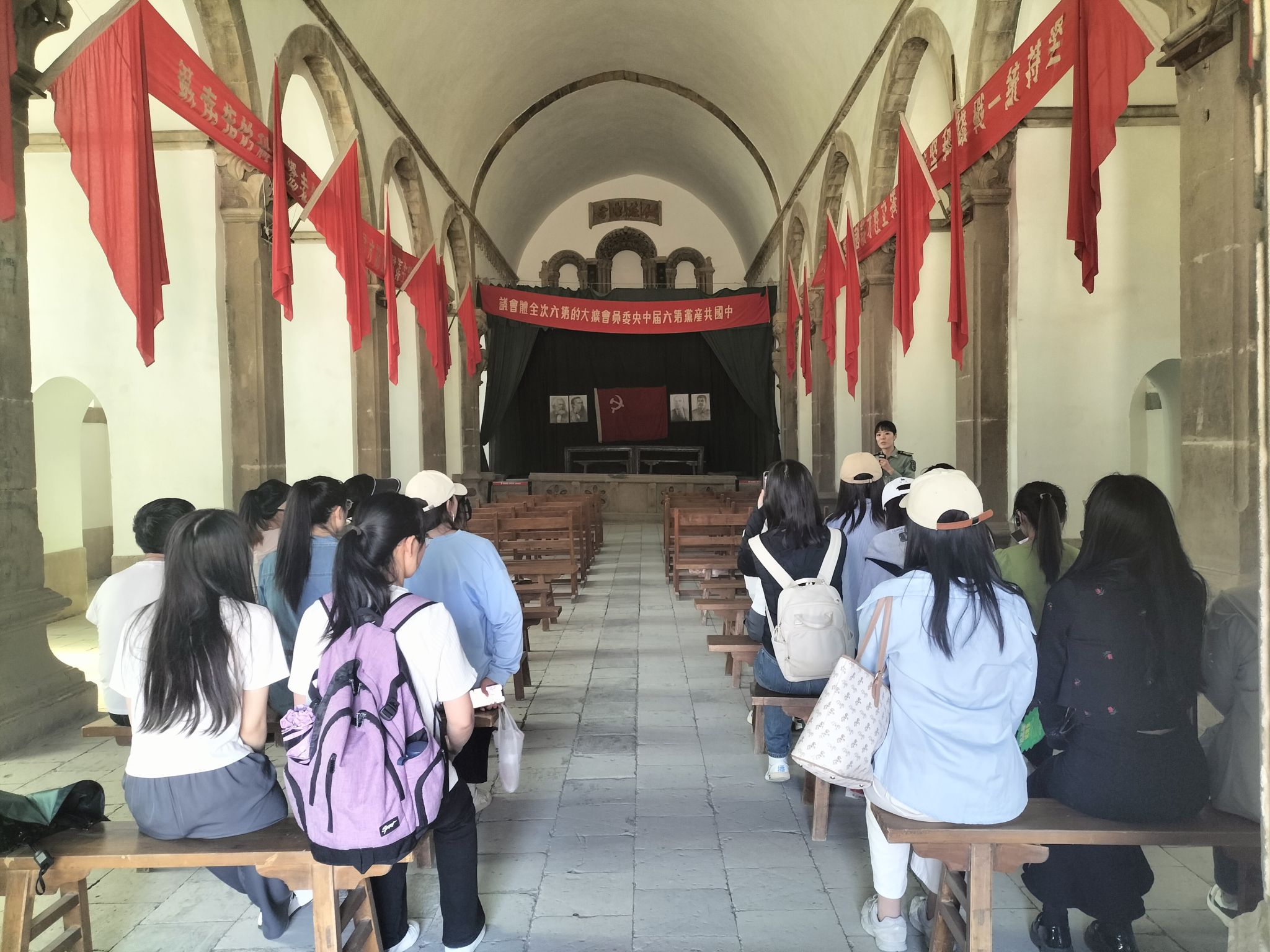 首先,全体成员在讲解员的带领下学习了延安时期“鲁迅艺术文学院”的创办历程、典型事迹、历史贡献,感悟“走出小鲁艺、走向大鲁艺”的峥嵘岁月,聆听“紧张、严肃、刻苦、虚心”的谆谆教诲。随后,雷文静等同学现场朗诵了延安时期的青年故事,分享了参观学习体会。接着,研究生党支部书记姜家兴作了题为《延安时期的青年运动及其当代启示》的现场教学,讲述了“打断骨头连着筋,扒了皮肉还有心,只要还有一口气,爬也爬到延安城”的热血青年,分享了“在有字之书和无字天书汲取营养”的学习方法,回顾了“延安的青年运动时全国青年运动的模范”的历史事实。