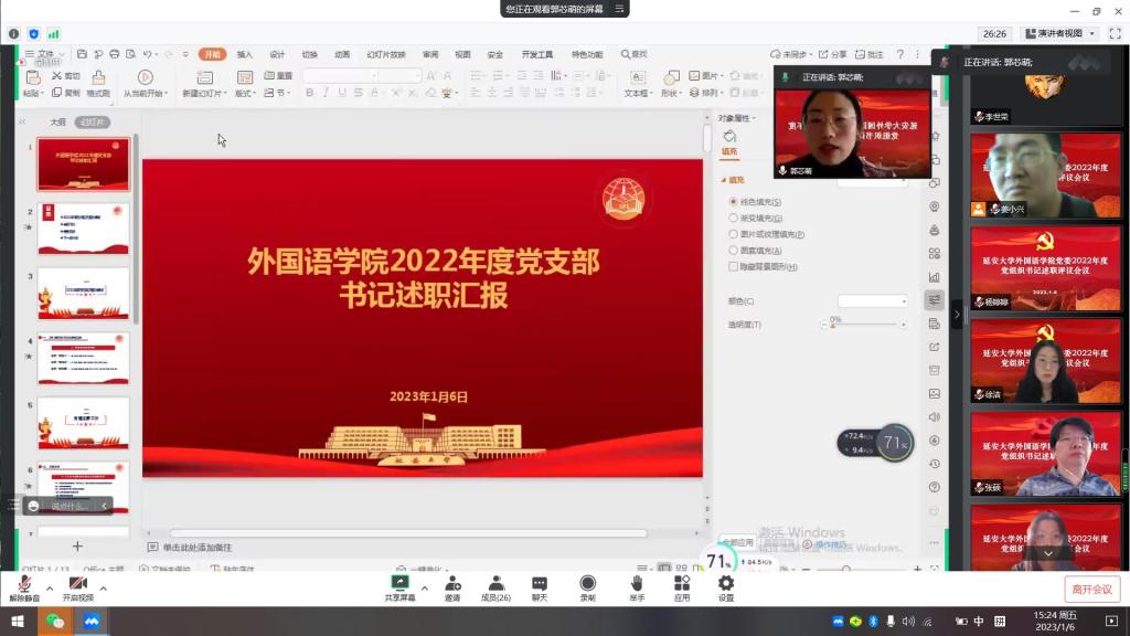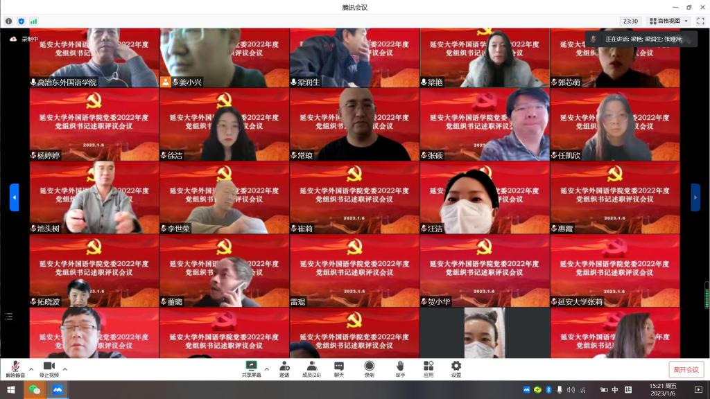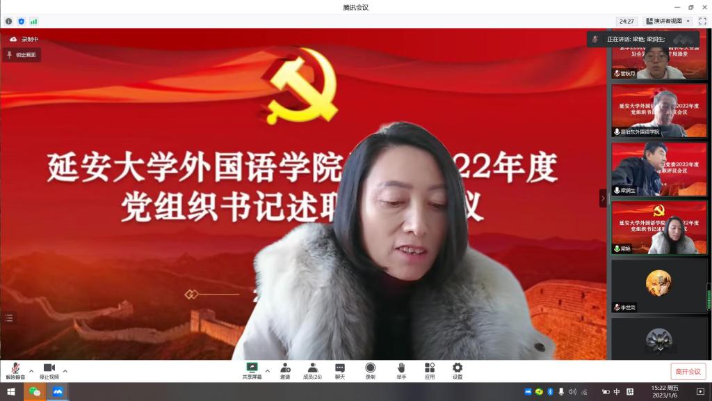 1月6日下午,我院以腾讯会议的方式举行了2022年度党组织抓基层党建工作述职汇报会议。学院党委领导班子、教工党支部委员、教师和学生代表参加了会议。会议由党委书记梁艳主持。