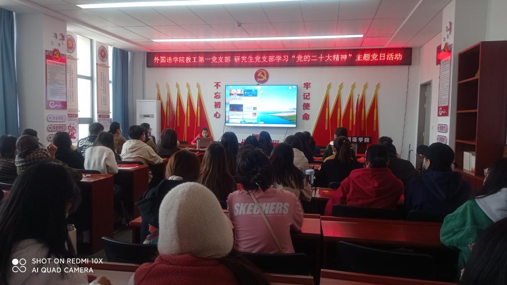 党日活动在全体成员齐唱《国歌》声中正式开始;首先,教工第一党支部书记李艳围绕党的二十大报告中的“报告主题、中国式现代化”用英文方式进行了现场宣讲,并讲解了英文翻译基本技巧;接着,支部成员李丽、郇芳分别围绕党的二十大报告中的“科教兴国战略、寄语广大青年”等内容进行了英文宣讲,并对“新征程、新发展理念”、“一带一路”、“中国故事”等双语热词进行了讲解;随后,研究生党员用中英文方式畅谈了心得体会;主题党日活动在全体齐唱《中国共产党入党誓词》中结束。