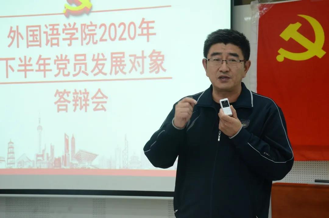 2020年12月29日下午,为持续推进“不忘初心、牢记使命”主题教育,贯彻党员发展的“十六字”方针,我院在外语楼211教室举行2020年下半年学生党员发展对象答辩会。学院院长兼党委副书记梁润生、教工第一支部书记李艳、教工第二支部书记高治东、研究生支部书记姜家兴、本科生支部书记徐洁担任评委。学院第56和57期入党积极分子共计100余人观看了答辩会。