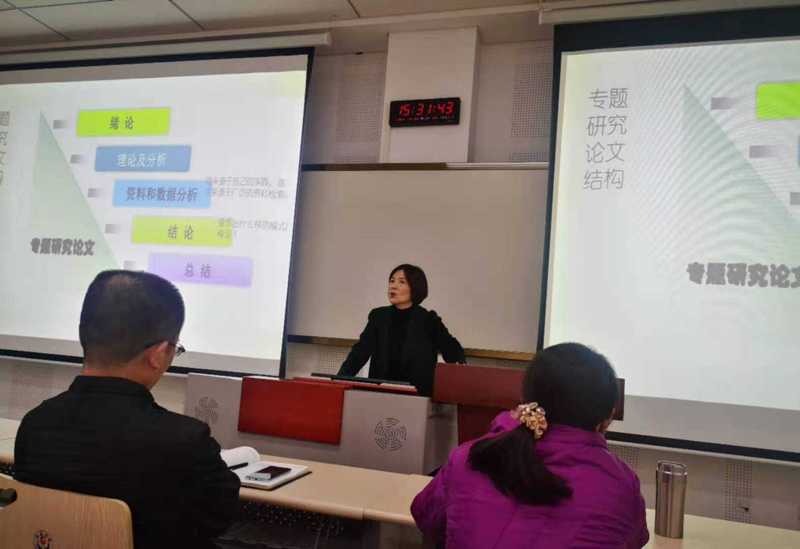 我院学科教学导师组组长张纪鸽副教授向新遴选导师介绍了教育硕士专业学位的培养流程,明确了教育硕士培养流程中的重要环节,阐述了学位论文的写作规范,并以往年毕业论文为例,分析了导师在论文指导中的常见问题。