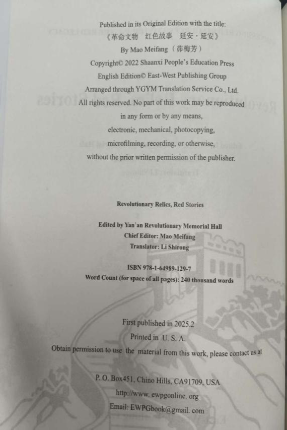 美国东西方出版社致力于促进东西方之间的对话与交流,强调跨文化、跨学科的综合与比较研究,出版各类图书,涵盖人文、社会科学、文学/艺术等学科领域。《革命文物 红色故事 延安·延安》由延安革命纪念馆原馆长茆梅芳主持编著。作者以党在延安十三年革命活动为主线,从馆藏中遴选出百件珍贵革命文物,集文字和图片为一体,讲述了100个文物背后的故事,通过文物串联起延安时期的重要历史事件、人物事迹和精神传承,带领读者走近文物,感知历史,了解革命文物所承载的党和人民英勇奋斗的光荣历史,体会延安精神的深刻内涵,是弘扬革命传统和革命文化的生动教材。本书的英译是顺应国家战略,践行国家红色文化宣介方针,促进中外文化融通与文明互鉴,助力国家讲好中国故事,为推动中国红色文化走出去,帮助国外读者更加全面深刻地理解中国,促进区域经济文化发展,助力学校更好地服务地方。
